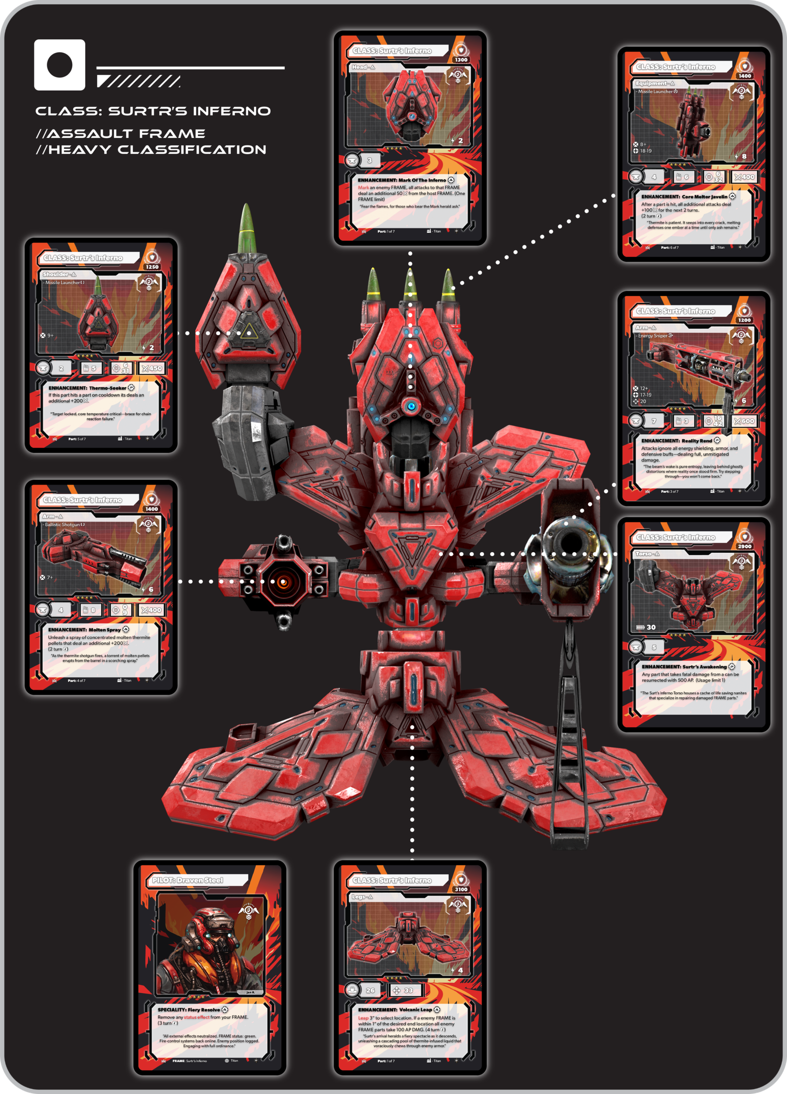 Positioned on top of the Torso, the FRAME head plays a critical role in processing information and coordinating the FRAME’s systems in combat. Each Head also comes with a unique enhancement, adding specialized abilities that can turn the tide in strategic engagements.